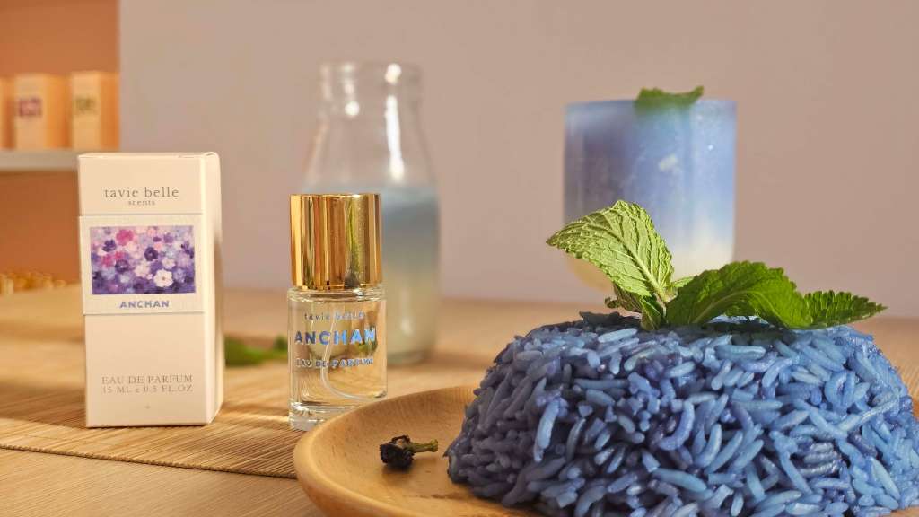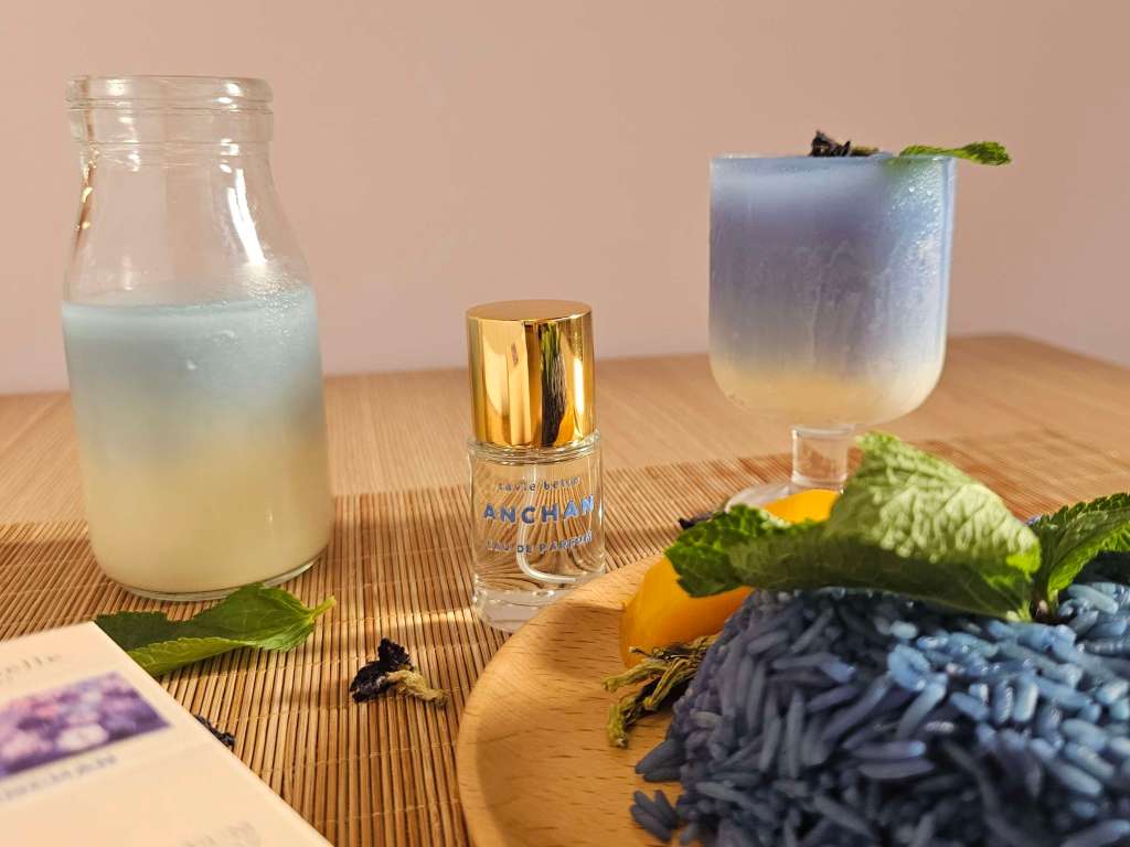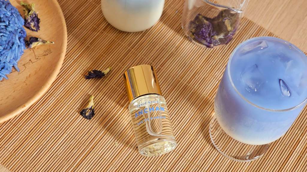 We have our newest Big C fragrance Anchan, inspired by a childhood memory of enjoying butterfly pea flower tea and blue rice in Thailand, a tropical and floral fragrance sweetened with coconut and rice notes.
